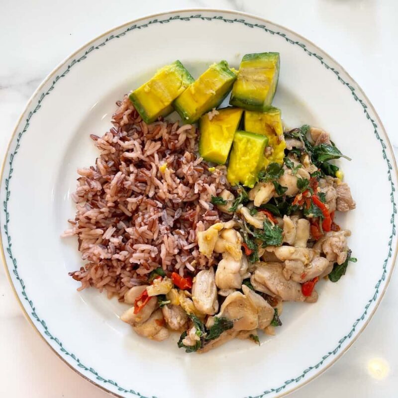 ✅ เมนู 1: ผัดกะเพราอกไก่ไข่ขาว (Low-fat High-protein)ใช้อกไก่สับ (ไม่ใส่น้ำมัน)